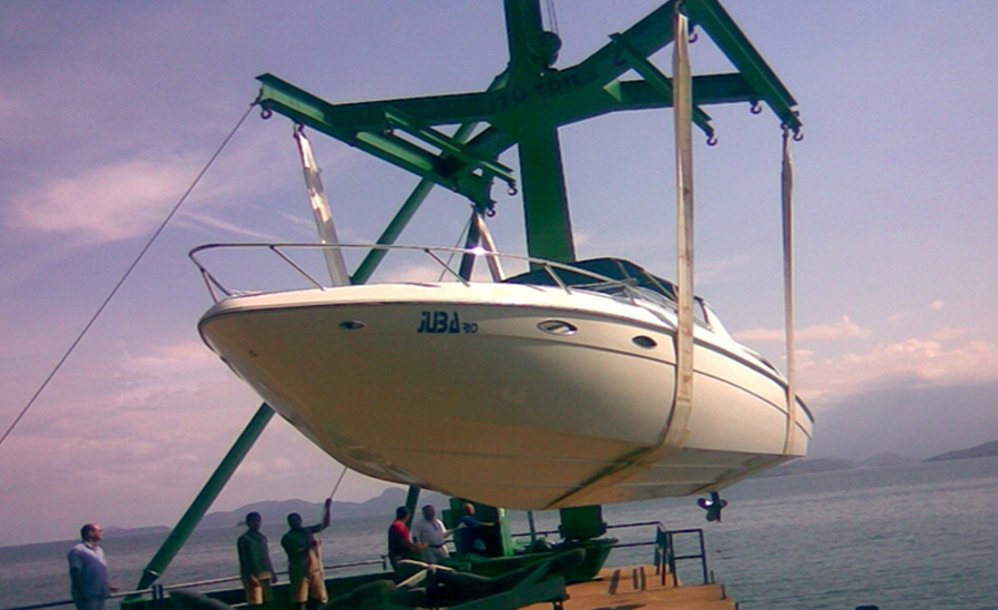 O Guindaste Derrick Monovia é um equipamento próprio para uso em marinas e iate-clubes. Seu movimento, de giro manual, é extremamente leve uma vez que o mastro se encontra apoiado em mancais de rolamentos.